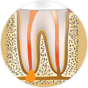뿌리 끝부분에 낭종이나 농양 또는 육아종을 확인합니다.