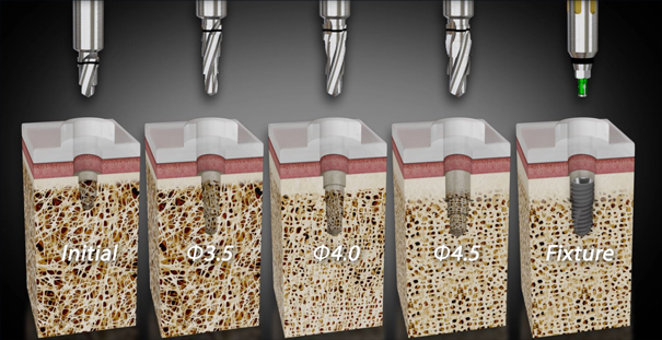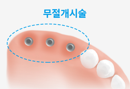 일반적인 임플란트 수술의 경우 임플란트 픽스쳐(Fixture) 부분을 잇몸뼈에 심기 위하여 잇몸을 절개하게 됩니다. 이 과정에서 필연적인 출혈과 통증이 발생하게 됩니다. 이러한 절개 과정을 생략 혹은 최소화하여 통증 및 출혈을 줄이고, 회복기간을 줄인 치료방법입니다.